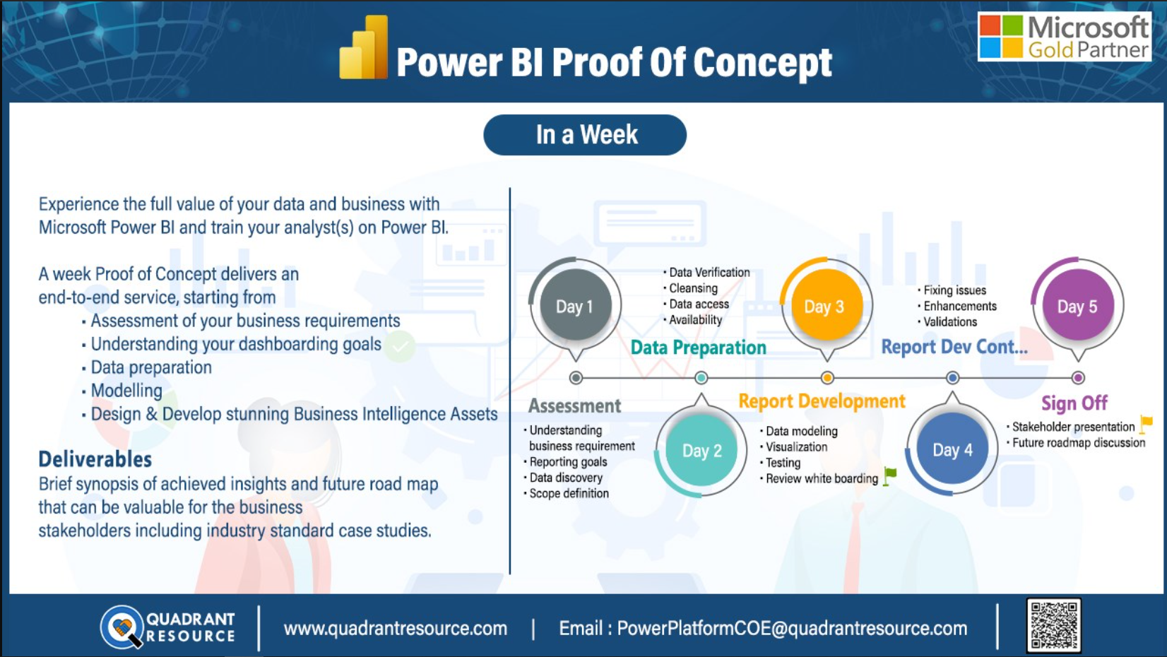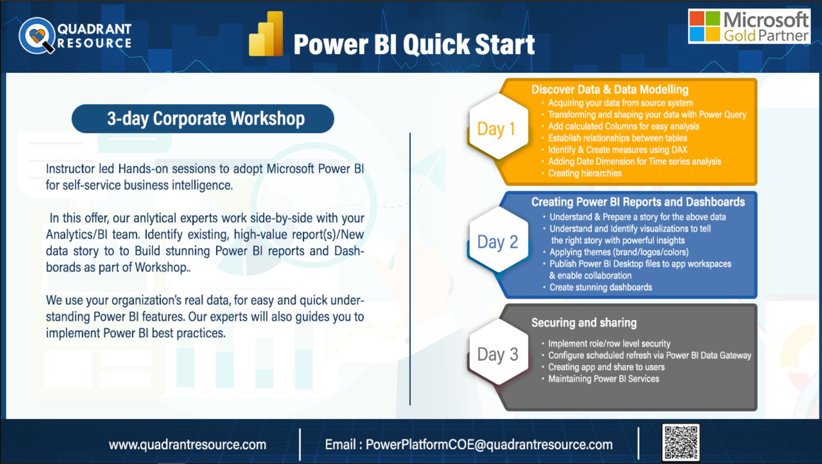Instructor led Hands-on sessions to adopt Microsoft Power BI for self-service business intelligence in 3 days. Our analytical experts work with your Analytics/BI team to implement Power BI.
